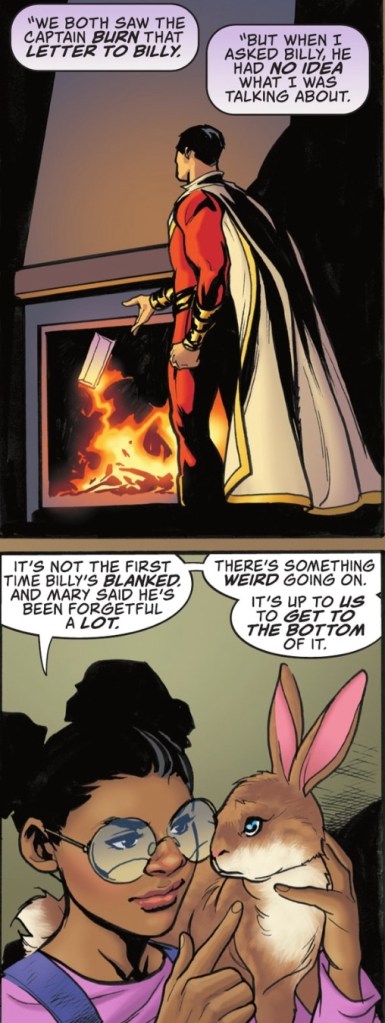 I generally agree about the point that the other kids and adoptive parents should be more in the background. The caveat is that I’ve come to like the idea of Mary having also as much prominence as Billy because she serves as an interesting counterpoint to Billy. That’s partly because she’s no longer a kid and thus really experiences the Shazam transformation as a straightforward acquisition or loss of power and not as an additional transition from childhood to adulthood; partly because seeing how she’ll define herself now that she’s a notionally independent adult is interesting in its own; and partly because she effectively serves as a check on some of Billy’s issues with the power due to her greater maturity and lack of split personality issues. If she’s not featured in her own series, having her co-star with Billy in this title is therefore a pretty solid narrative choice.