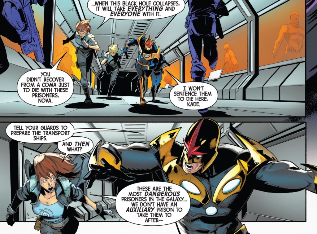As Nova and friends try to put a lid on things Jean Grey, having saved a world, talks to husband Scott Summers. They end things abruptly when a cry for help is received from the aforementioned Human Rocket, Richard Rider.