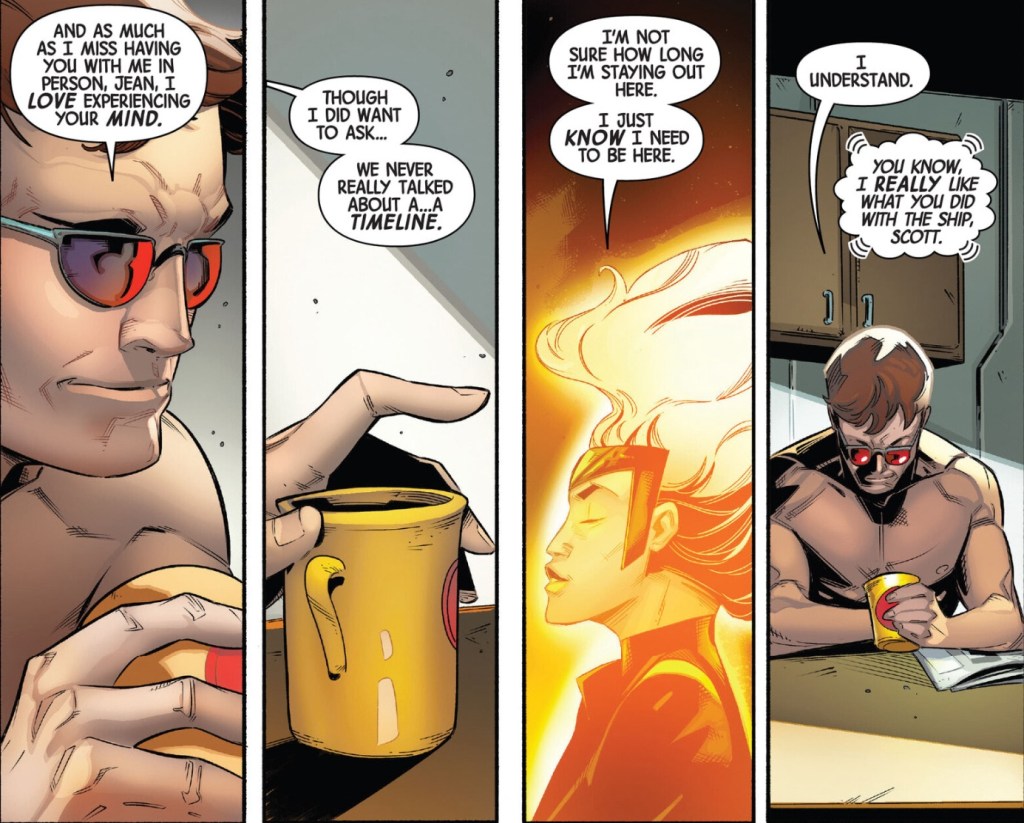3. It was a very good Marvel cosmic book but that category is not my thing so this’ll be my only issue. Frankly, I prefer the Phoenix that kicked Fire Lord’s ass and showed off on Muir Island to the cosmic one. The Scott stuff was nice but needed more pages and would have meant more if Jean had built a mental construct of a home for them to interact in. I also preferred Scott with Emma, TBH.