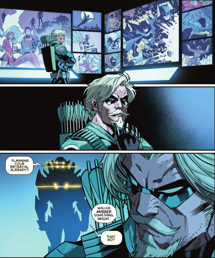 So yes, what is he up to? I’ve seen arguments online that joining Waller isn’t out of character for Green Arrow as he’s been on the outs with his fellow heroes so many times, but come on, Waller isn’t just The Man, she’s the ultimate Man, authority writ Prometheum Giant large. Ollie cannot be on her side. Even his Waller colleagues don’t believe it.