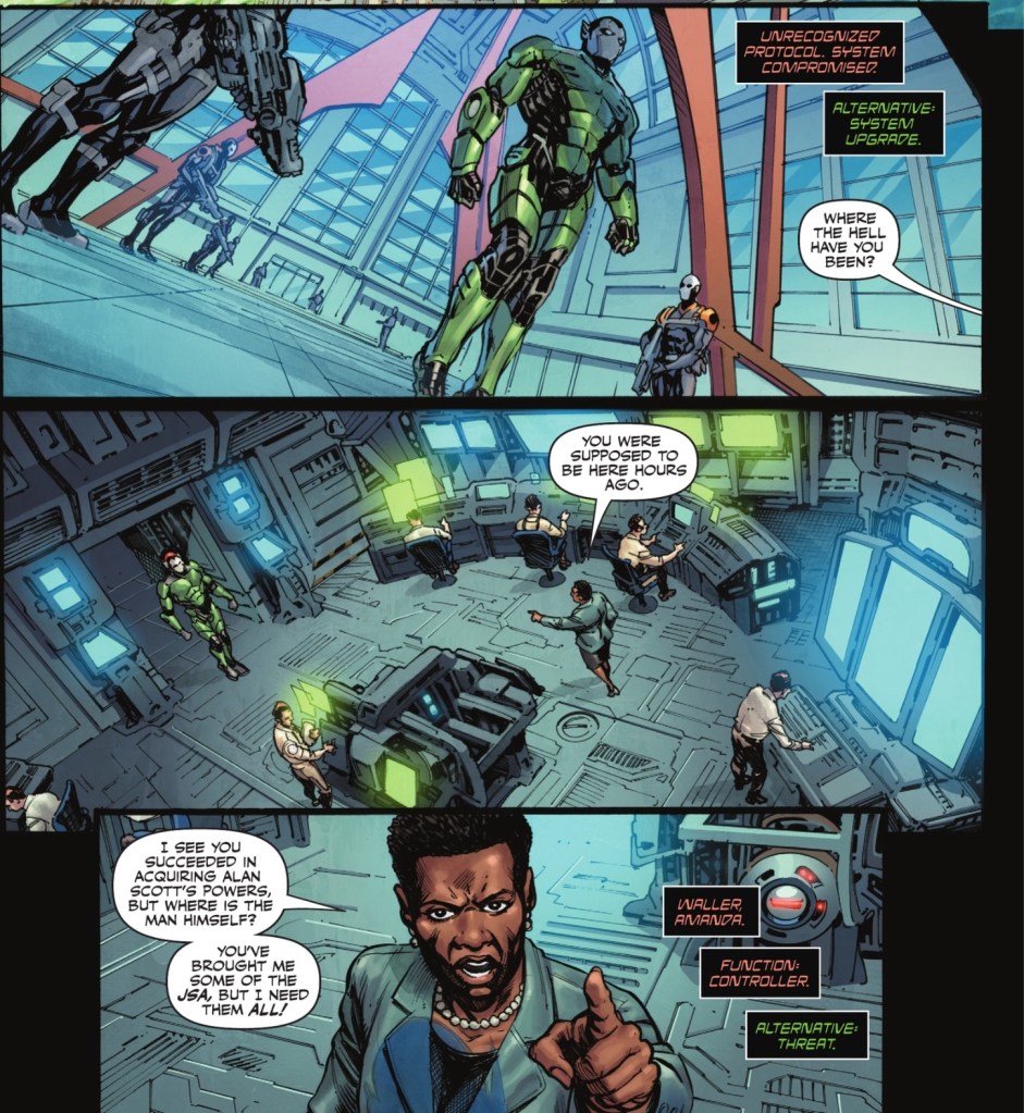 The Amazo’s new powers, though, allowed it to keep up and it makes fast work of stealing power from the likes of original variety GL Alan Scott. Then, without warning, the android shuts down.