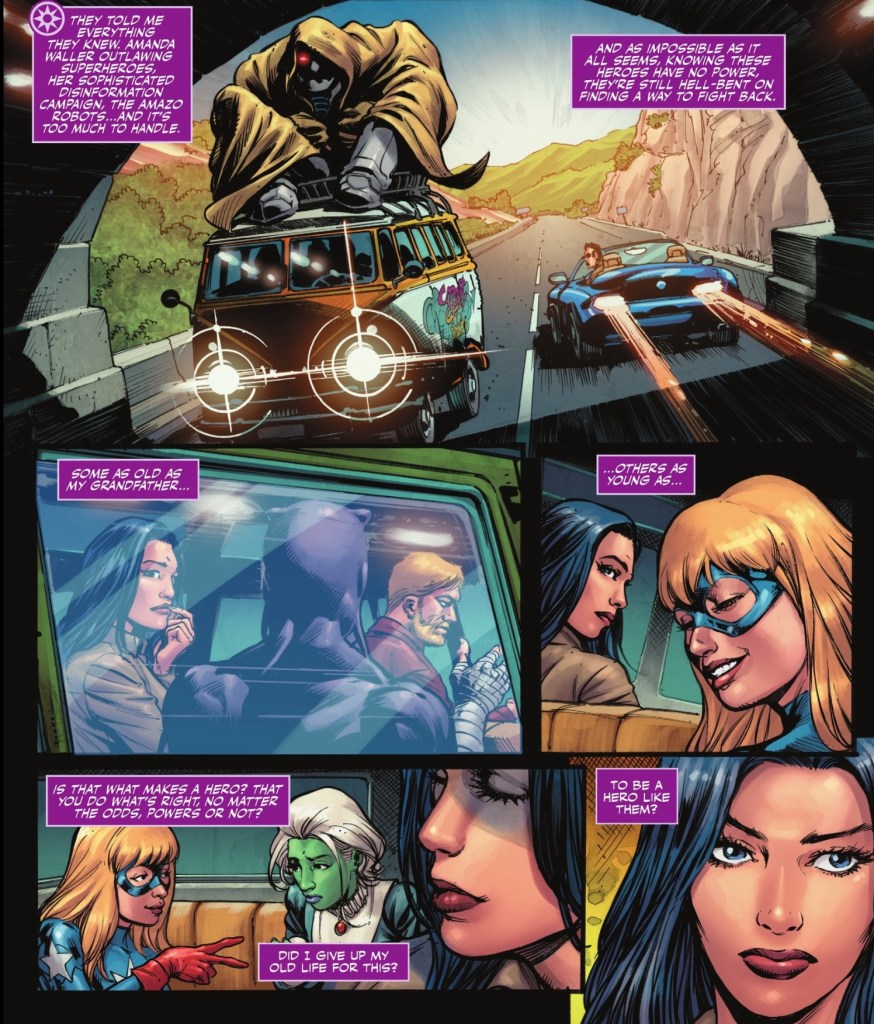 While the heroes flee in a minivan with sometime Star Sapphire Carol Ferris, whom they’ve rescued from the spot where the missing Hal Jordan parks his caravan, the green power-infused Amazo is changing. Once again mobile, he heads back to Waller’s US HQ.