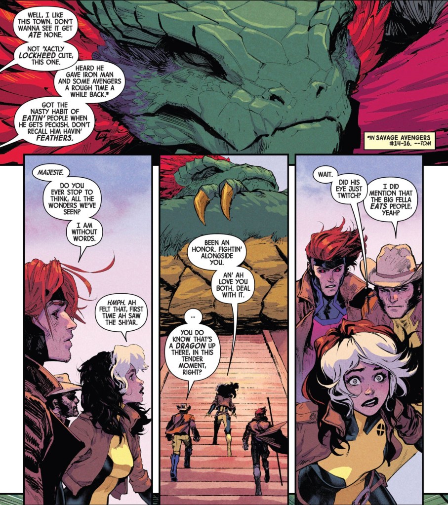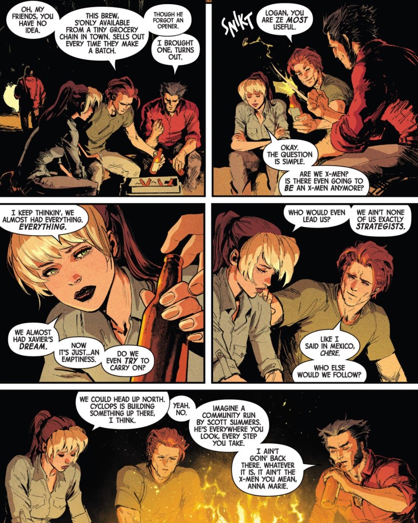 It’s a new beginning for our merry mutants, as they put the Krakoa experiment behind them. Logan has lived through decades of upheaval and is typically stoic, ready to see what life sends his way next. Remy’s devil-may-care ways have him happy to live in the moment. But Anna Marie is feeling a little lost.