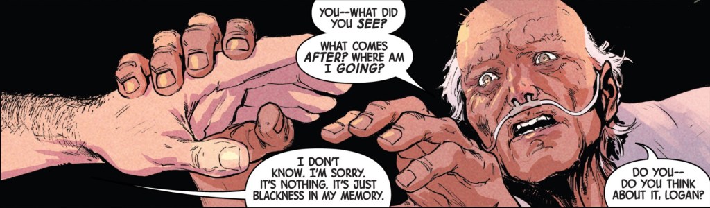 And the visual storytelling… I don’t know if Marquez and Simone have worked together previously, but they are soooo sympatico. It feels like they’ve been a team for years. Marquez lays down some very stylish lines, somehow he can set a very detailed image by a cartoony figure and it’s great, just what the story needs. Standout panels include a close-up of Sadurang, and an old friend of Logan begging the occasionally deceased mutant for reassurance about an afterlife.
