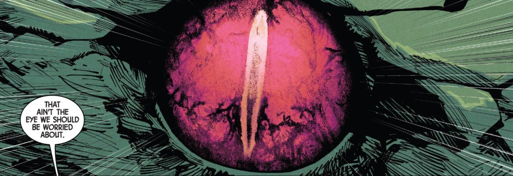 A regular eye. Well, a regular monstrous eye. It’s actually a few pages on that we’re told the creature’s Really Scary Eye is an Eye of Agamotto, and a few pages after that, that we learn it’s located on the belly of the beast. That’s when we finally see a very recognisable EofA. I wonder if the panel above and the dialogue could be tweaked for the collection, to make things a tad clearer.