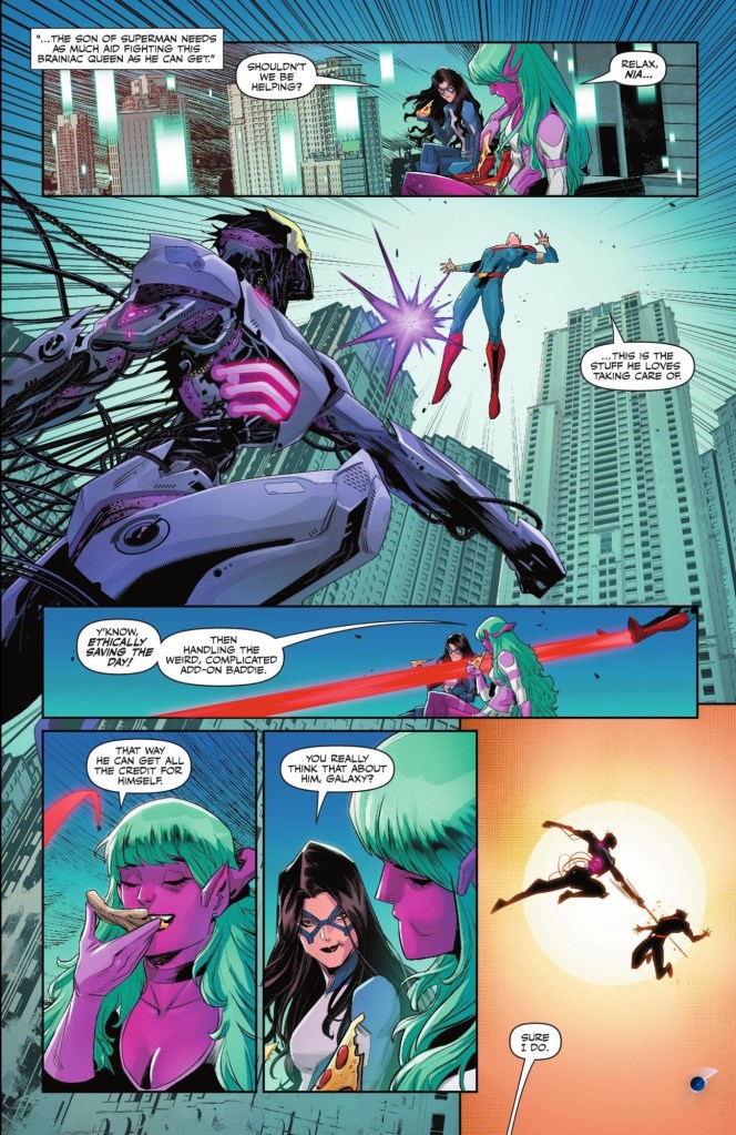 I’m no fan of Galaxy, ‘the prettiest star’, she’s far too flighty, but I laughed at her line about Jon’s approach to superheroing; it sounds as if, like me, she just wants Jon to punch more. While Galaxy doesn’t wish to get involved, Dreamer, with her UDN (Undefined Nonsense Powers), is able to talk Superboy through the pain of his memories and out the other side.