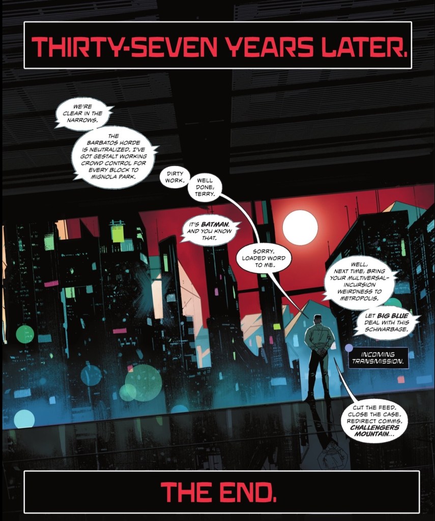 Sadly I have to agree! I thought around the middle of the series there was some goo stuff and had been ready for some metafictional ending, but a metafictional ending has to comment on something (like the Doomsday clock stuff about Supes being the heart of the universe). We seemed to be edging towards it with the stuff about Bat-stuff overwhelming narratives and the need to break from that, but then we took this weird sharp turn.