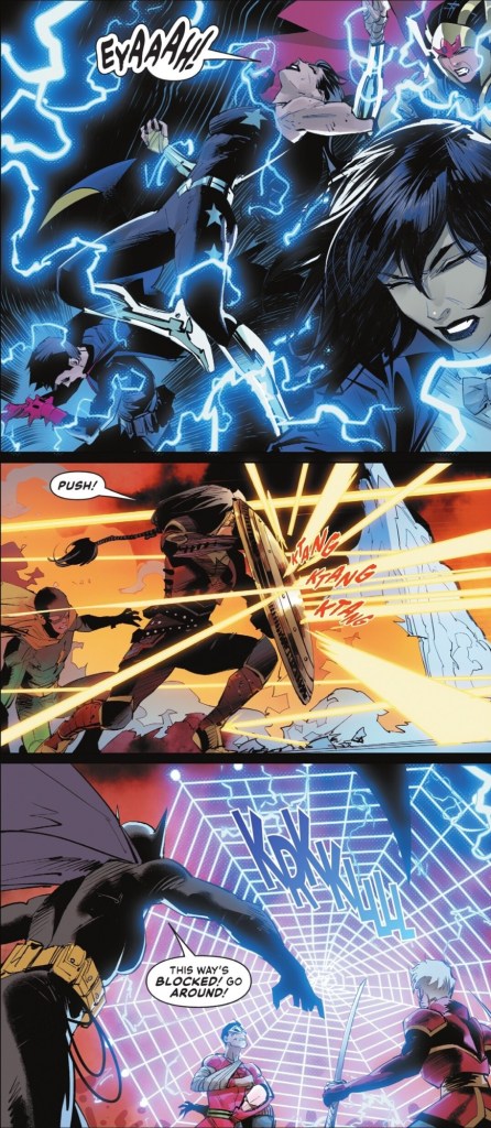 Alejandro Sánchez adds colour and light, giving an extra burst of energy to scenes such as Mora’s two-page collage of the heroes getting powers back… even if it’s not necessarily their own, a story point to be dealt with in DC books going forward.