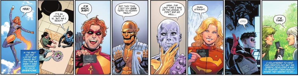 Soon, the big day arrives and heroes who have accepted the offer – it seems that, like, Robotman, Metamorpho says no – are addressed by Mr Terrific.
