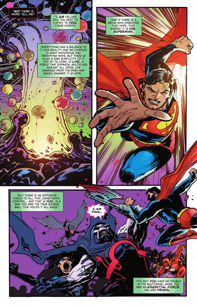 The business about Superman energy setting the tone for the universe is objectively weird, but it’s not new, having been established in Doomsday Clock #12. I’d assumed that piece of Geoff Johns-ery would never be referenced again, so it’s fascinating to see it used.