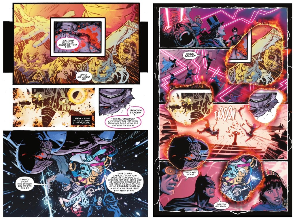 There’s a third artist on the book and that’s Dan Mora, who handles a chaotic cosmic spread connecting the two halves of the whole. Coloired by Tamra Bonvillain, it’s a terrific take on some Absolute characters DC hadn’t previewed and I love it