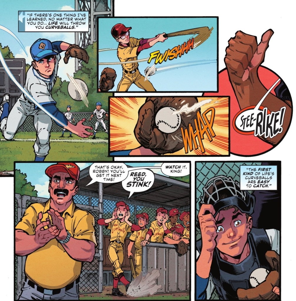 And it’s not that I don’t like Courtney, I’ve followed her since way back in Stars and S.T.R.I.P.E. #1 and through to the recent Stargirl: The Lost Children series. And I did like this story, which begins at a baseball game in Blue Valley, home of Courtney and her family.