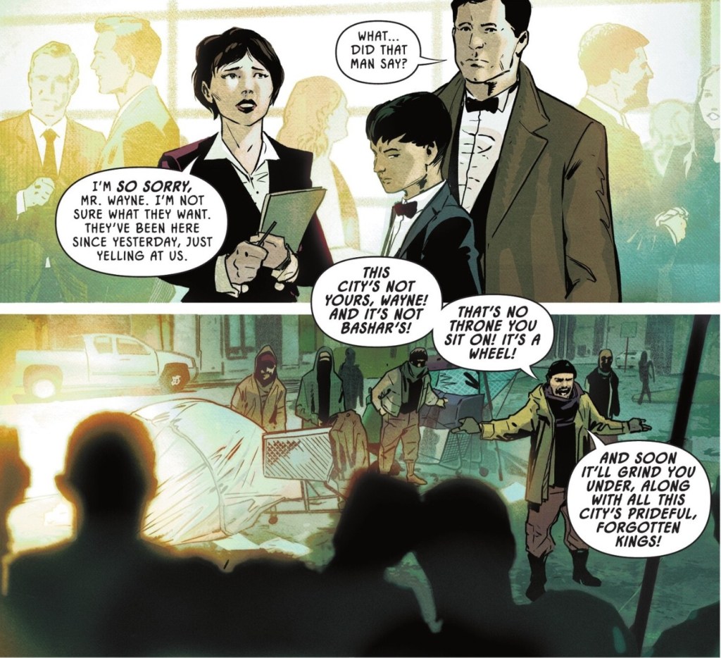 Gotham City, 2024, the next evening, and Bruce and Damian Wayne are not enjoying a night on the town. The tuxedos are itchy and Oracle says there’s a chance of trouble as father and son attend a do to welcome the new Director of the Sacred Heart Medical Center.