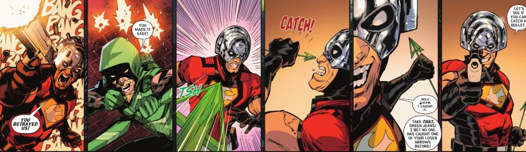 It begins with Green Arrow hunting down Waller’s henchpeople, Peacemaker and Peacewrecker.