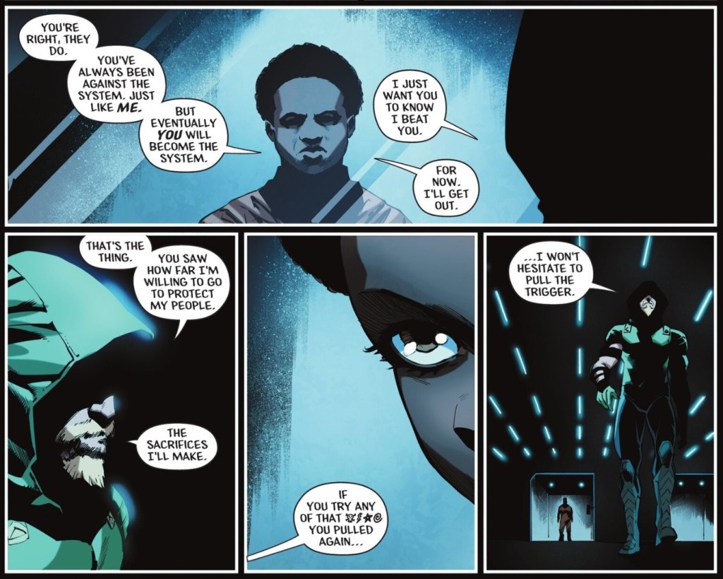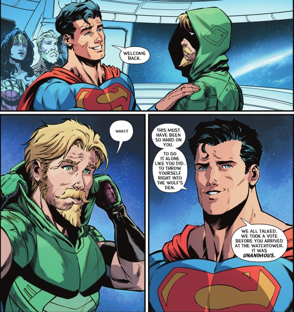 Popping up to the new JLA Satellite. Ollie tells the core members that in pretending to betray them to Waller, he did what he had to do, and if they don’t like it, tough.