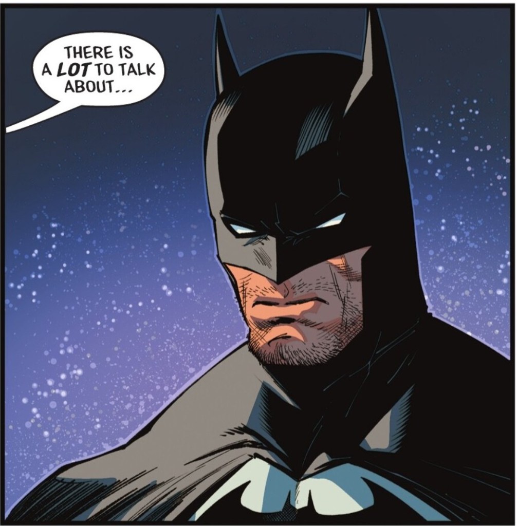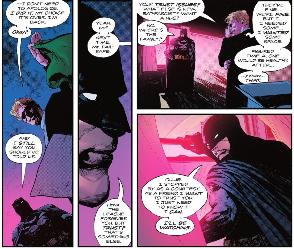 3. I’m fascinated that we ever need another scene where Batman tells a character he doesn’t trust them because isn’t that like 90% of all crossover scenes with him nowadays. We just assume it as a given. You’d think the greatest strategist in the world would appreciate a ploy like that and not get all emotional and passive-aggressive about it!