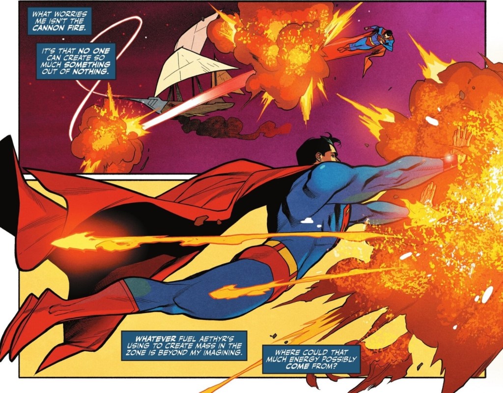 His thoughts return to the present as Mon-El’s ship nears Aethyropolis and is attacked by Phantom King Xa-Du’s own craft. His super powers fading, Superman nevertheless leaps to the defence of Mon-El and his crew of least worst Phantom Zone inmates.
