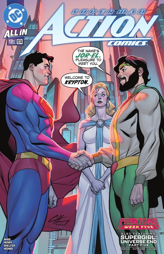… but we’ll get to that next week. For now I’d like to say how delightful I found this story – after the horrible Jor-El Brian Bendis gave us a few years ago it’s wonderful to see a more classic take. OK, the clothes Jor and Lara are wearing are pretty much the same as we saw in those issues, but not once does Superman think about having met his father previously, post-Krypton’s doom and basically demented. And if master of continuity Mark Waid, who’s writing the 12-part ‘Phantoms’ story in Action Comics, doesn’t mention it, we can all pretend those stories never appeared.