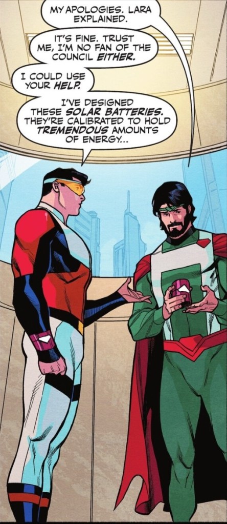 “That’s a bit of a white lie on Kal-El’s part, as the bands were designed by solar expert (and part-time supervillain) Bruce Gordon,”.