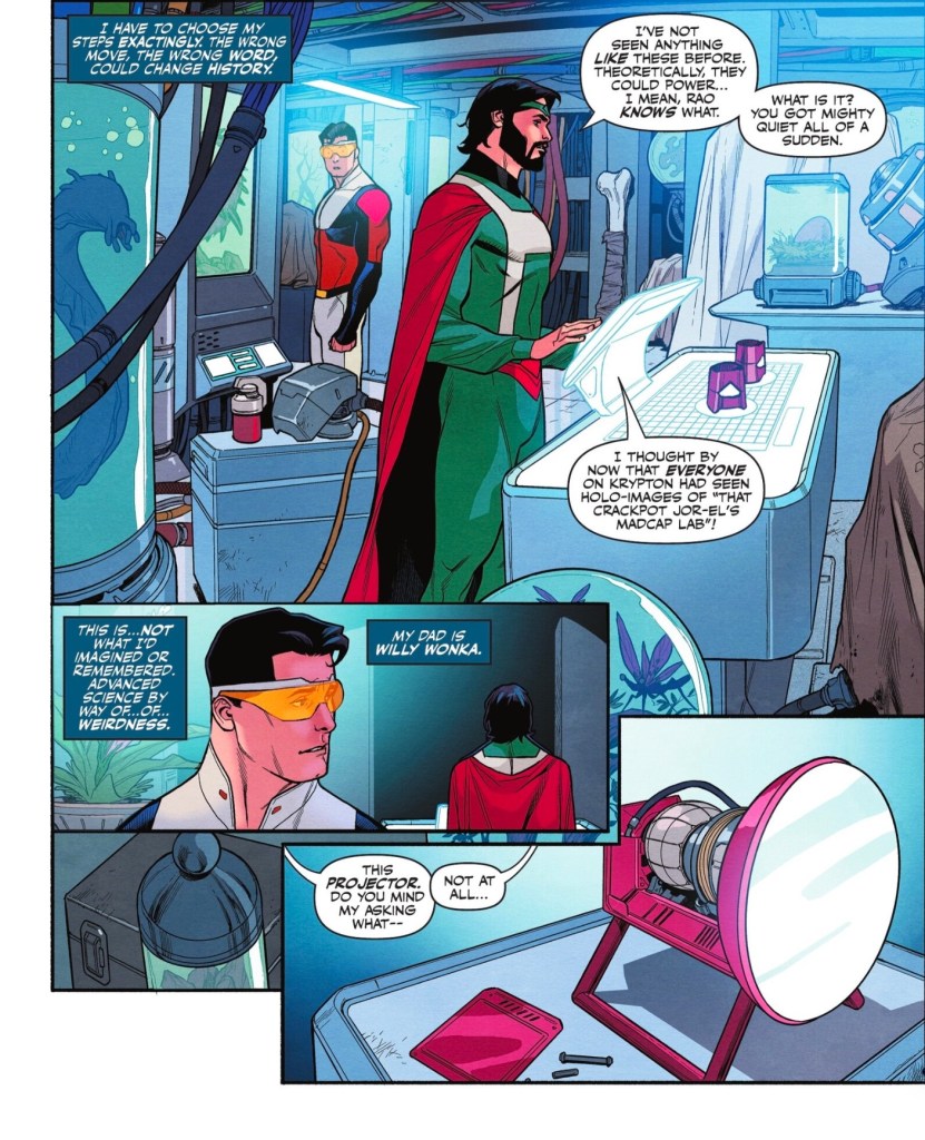 Readers of a certain age will feel a lovely nostalgia at this issue, which nods to such classics as ‘Superman’s Return to Krypton’, in which a time travel accident similarly sends our hero to his homeworld. There he spends time as Jor-El’s lab assistant, his opening gambit being to show his father a gadget he’s invented. This week, we get this.