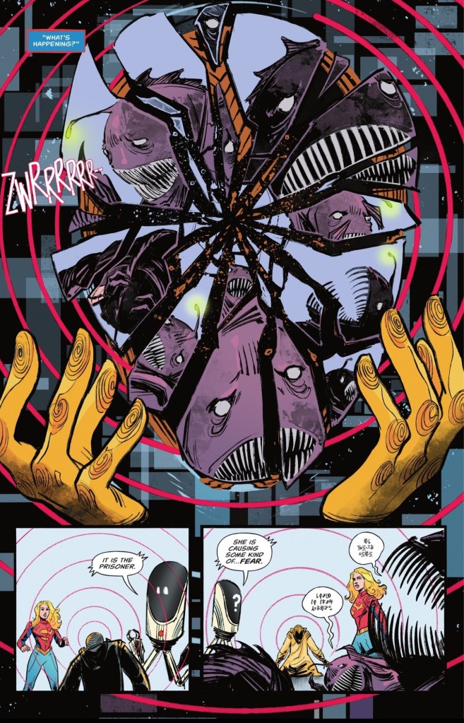 Also this issue, in a massive surprise the Supergirl back-up isn’t boring. While writer Mariko Tamaki still doesn’t tell us the identity of the prisoner the Girl of Steel has been sent to escort, we do see them without their robes and find out they have powers.