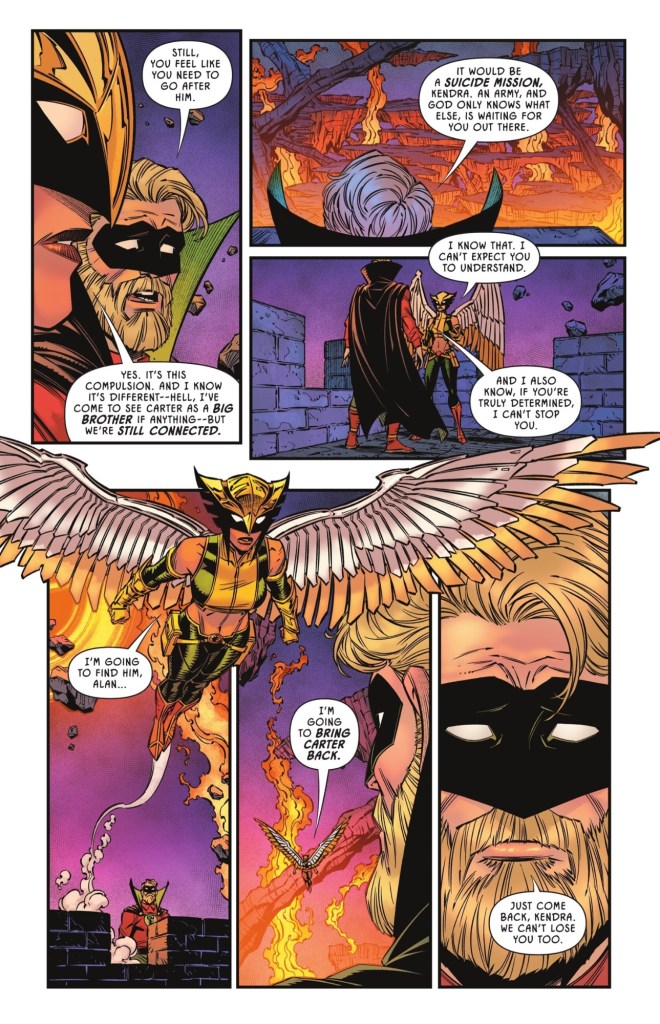 I hate that the great Hawkman series is apparently being ignored. I’d say retconned but that would require a depth of thought to the script that I don’t feel otherwise. BTW, I have always hated that Kendra exists as a character. I’ve always thought Johns made a mistake when he wanted a lesser version of Shiera back when. Her only through line is she’s incredibly inconsistent in how she feels about Carter. Also, Carter as a Wolverine wannabe has never appealed to me either. We have seeming billions of that in comics it feels like. What we don’t have are storied leaders of a team over decades or a happily married man with access to all of Earth’s knowledge (Absorbacon) and its weapons. Supposedly shocking angry visuals don’t replace either.