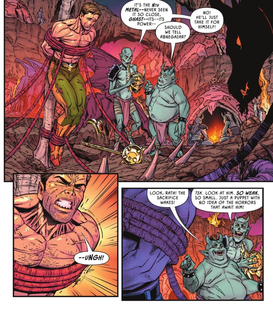 Hawkman died last issue. Don’t worry, it’s kind of his thing. Usually he reincarnates immediately, but this time he’s been dragged down to Hell. Dragged down by demons with familiar names.