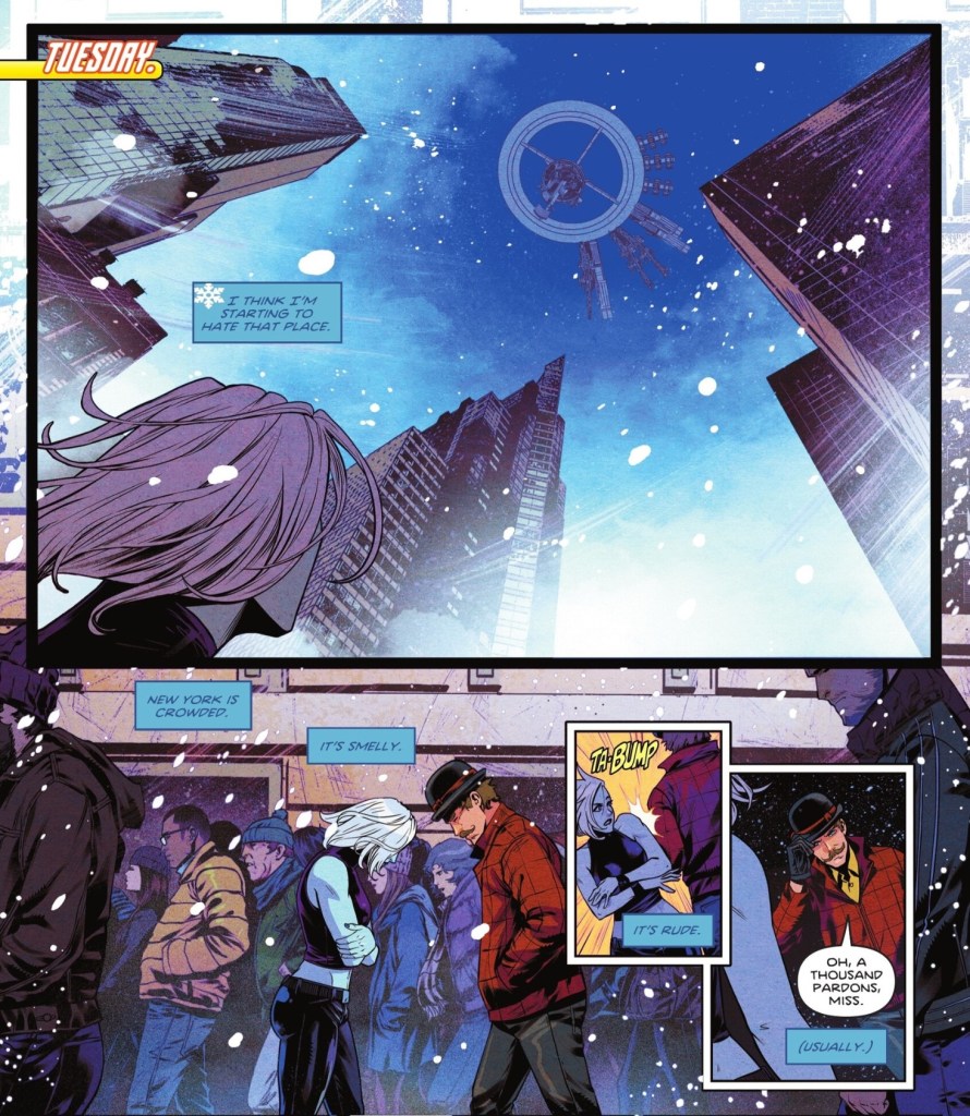 Trying to summon a boom tube to reach the Justice League Unlimited Watchtower, Caitlin Snow is pleased by a rare display of Big Apple manners.