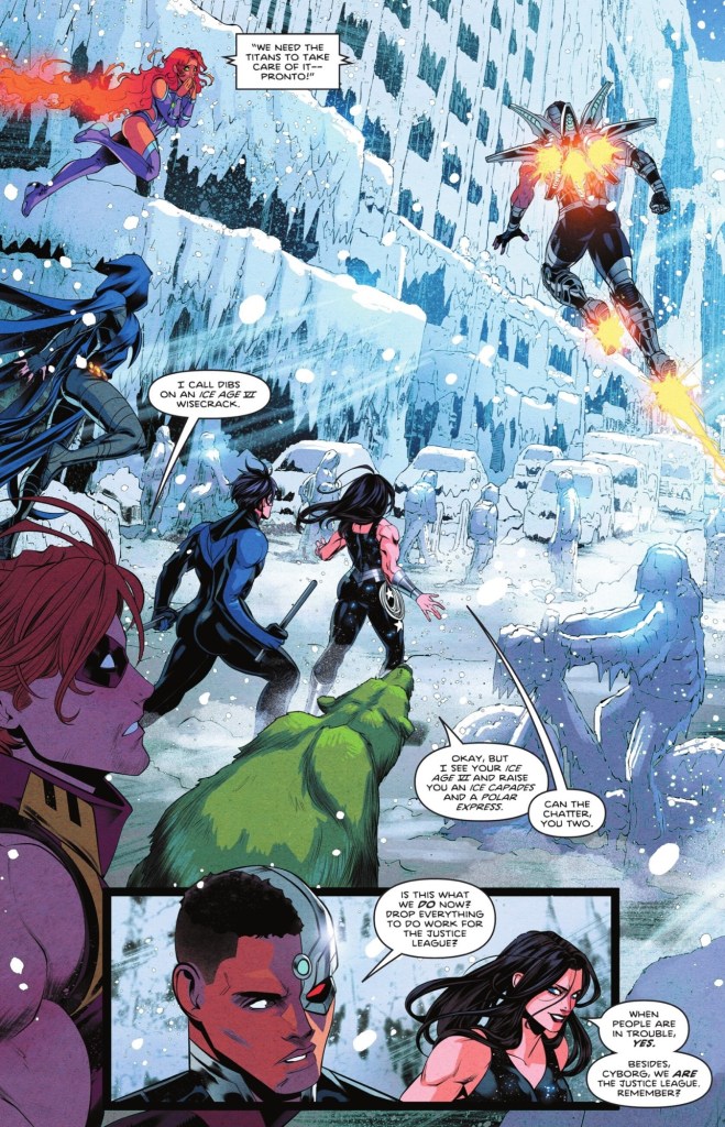 Some super-folk who aren’t all in with the new League set-up are the Titans, who are eschewing the offered quarters on the Watchtower to stay grounded. Today they’re discussing the welfare of one of their members. And building a snowman.