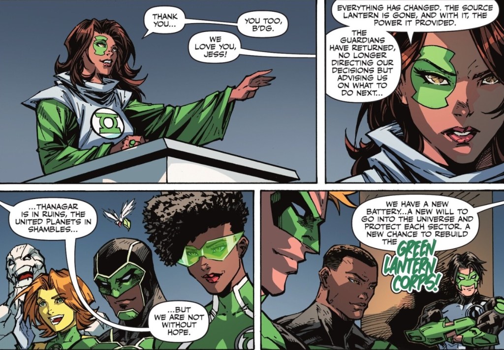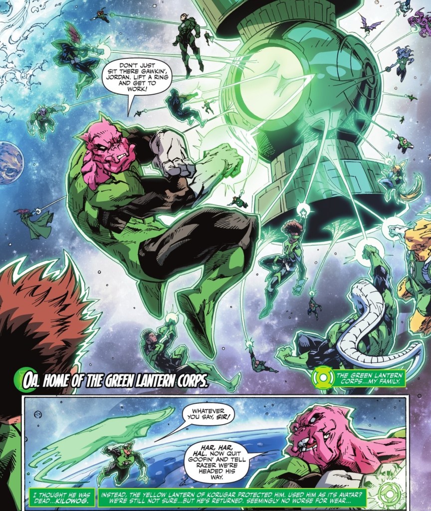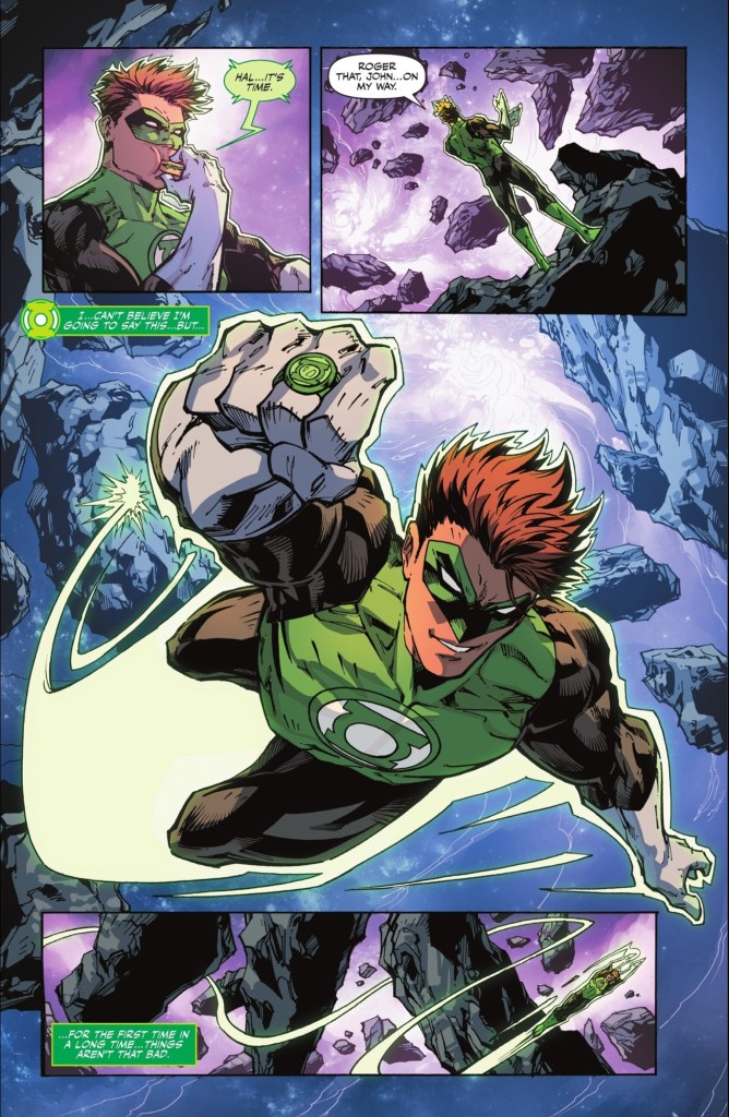 But not immediately, as Hal joins his Corps colleagues to restore power to Oa, the world that was for so long run by the Guardians of the Universe. Now, the Lanterns are in charge.