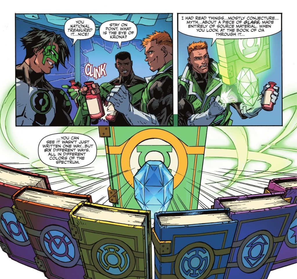 But what does the boyfriend-of-Carol-Ferris-turned-depressed-supervillain want? After he takes off with The Book of Oa, Guy Gardner speculates, first revealing he has a hobby – studying the history of that very tome.
