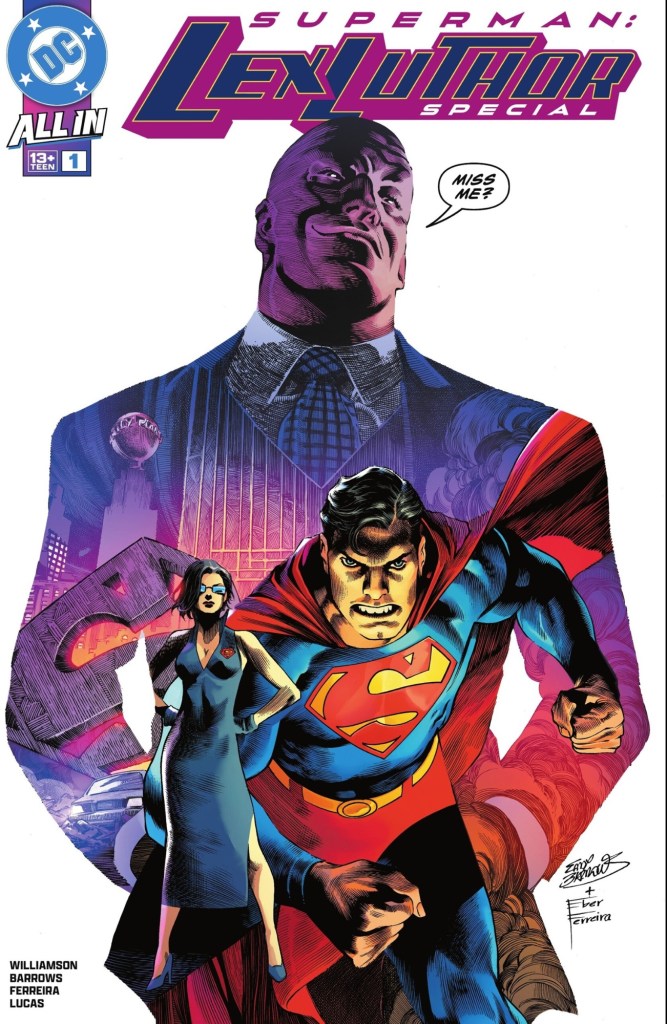 So, is the cover of this one-off telling the truth? Does the real Lex Luthor stand up, Superman’s childhood friend turned greatest foe? Find out – well, maybe – by buying this excellently crafted day in the life of Metropolis book. Superman is here, as you’ve seen, Superwoman too, but the one action scene in the issue is just a backdrop. The flashbacks interspersed throughout give us a look at what young Lex had to deal with as a boy, while the present day sequences tie into the ongoing DC All In storyline involving the disappearance and/or death of Darkseid.