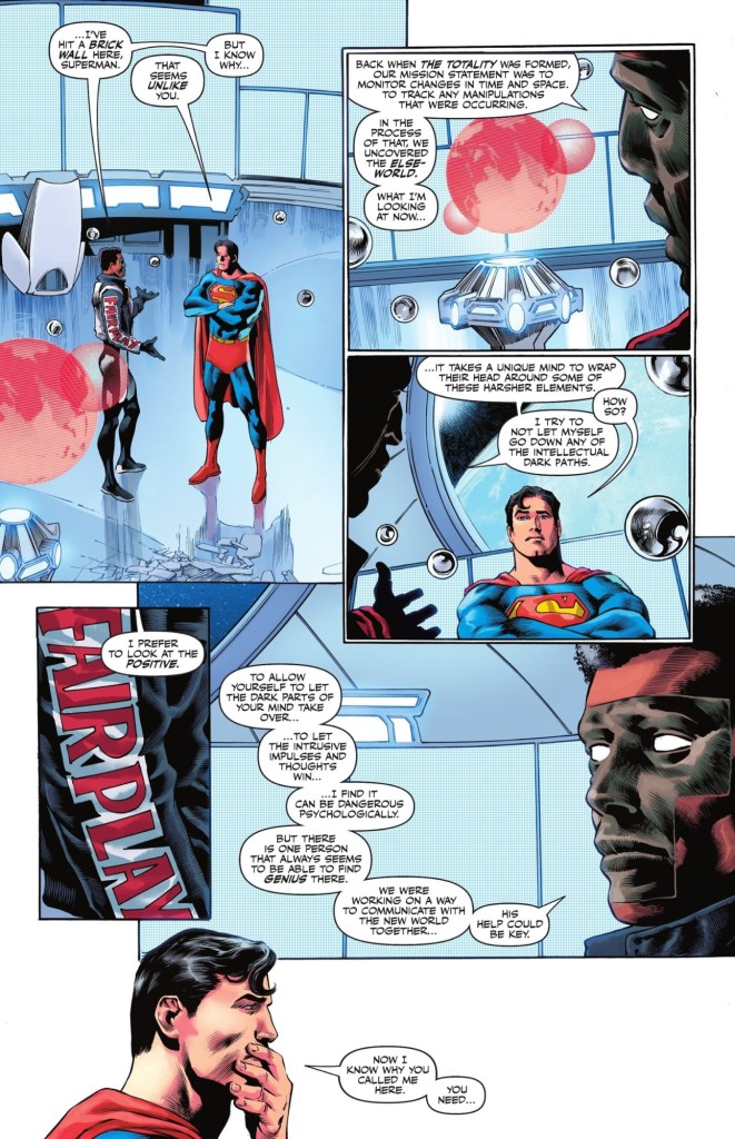Less well done for Superman’s panicked reaction when it seems Lex is tapping into his old self – it’s what Superman wanted, even if mainly on behalf of Mr Terrific, so why so appalled?