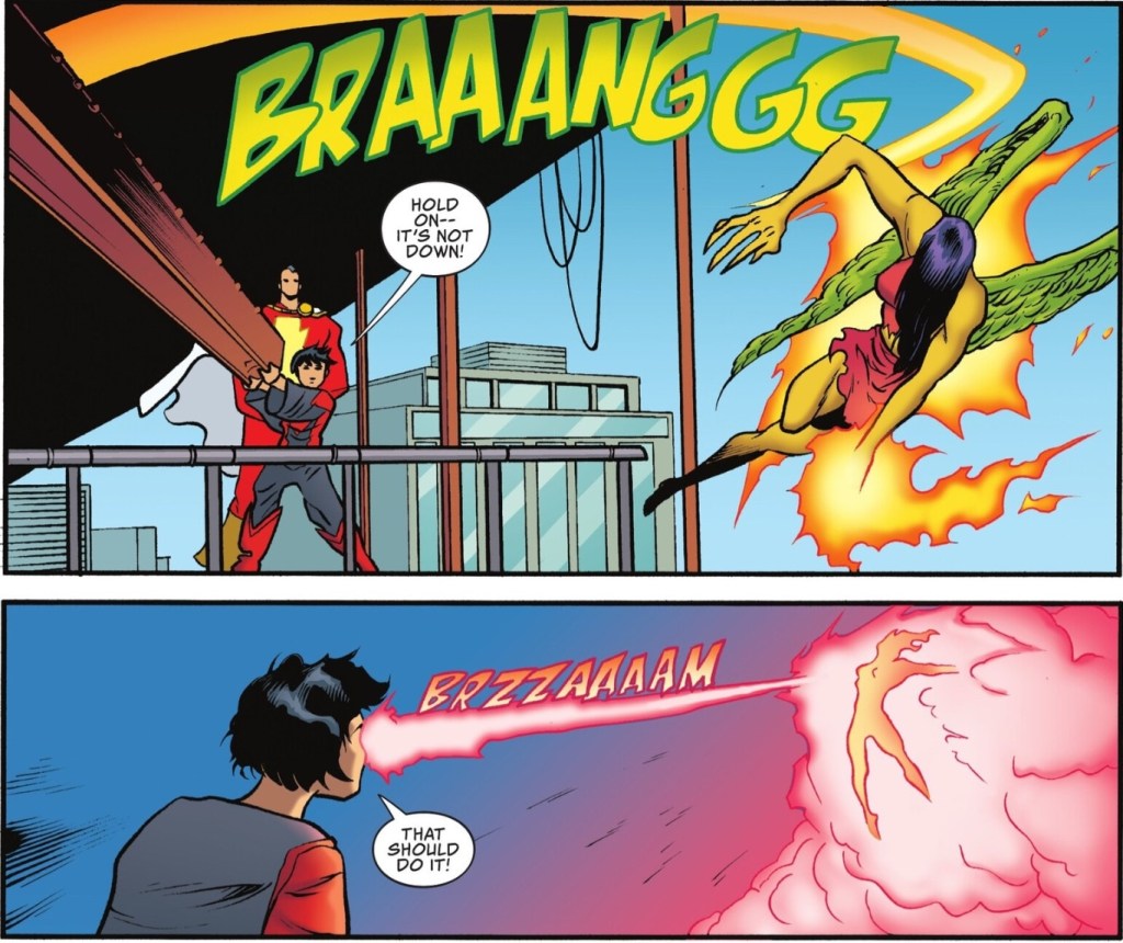 Arriving on scene, Mary Marvel shows she’s been reading her JLA files – or maybe it’s the wisdom of Minerva.