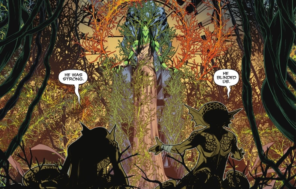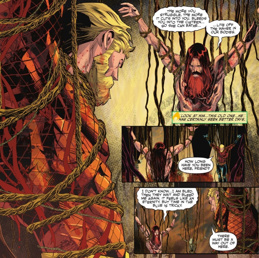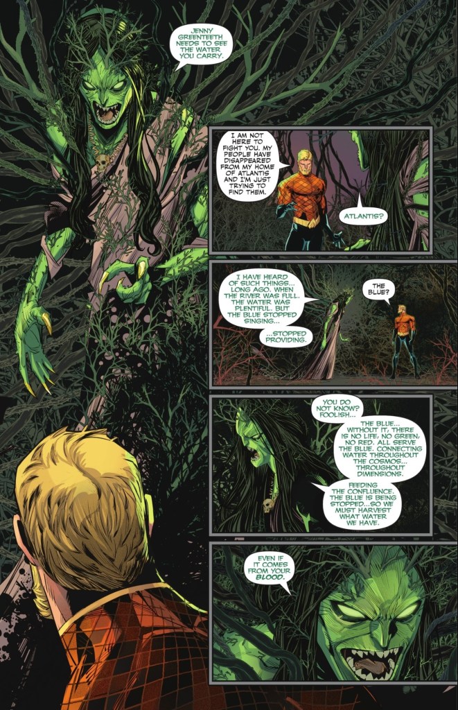 Her control over vegetation allows Jenny Greenteeth to drag Aquaman into the depths under her weird castle, and begin to bleed the king. Arthur is not alone in his torments.