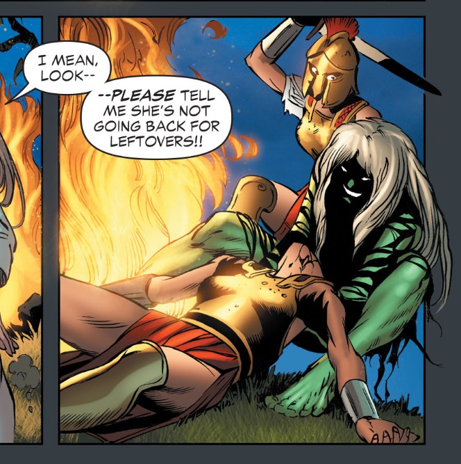 Oh I ad *one* little quibble. Why did the colourist choose to make Aquaman’s gloves and pants teal instead of their usual green? Were they that colour last issue? If so I didn’t notice. OR maybe it’s plot point. Is all of Aquaman’s costume coloured a darker shade becasue he went through Darkseid’s side door? I’d accept that, I guess. But I prefer the regular brighter green.