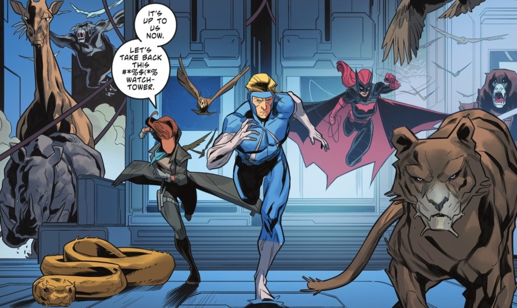 With no powers, Renee and Batwoman Kate Kane are unable to resist Cyborg Superman, his villainous allies and a handful of possessed good guys. One of them, Animal Man Buddy Baker, is left to look after Renee and Kate while Cyborg Superman gets on with his plan to blow up the Watchtower by merging it with the Zone.