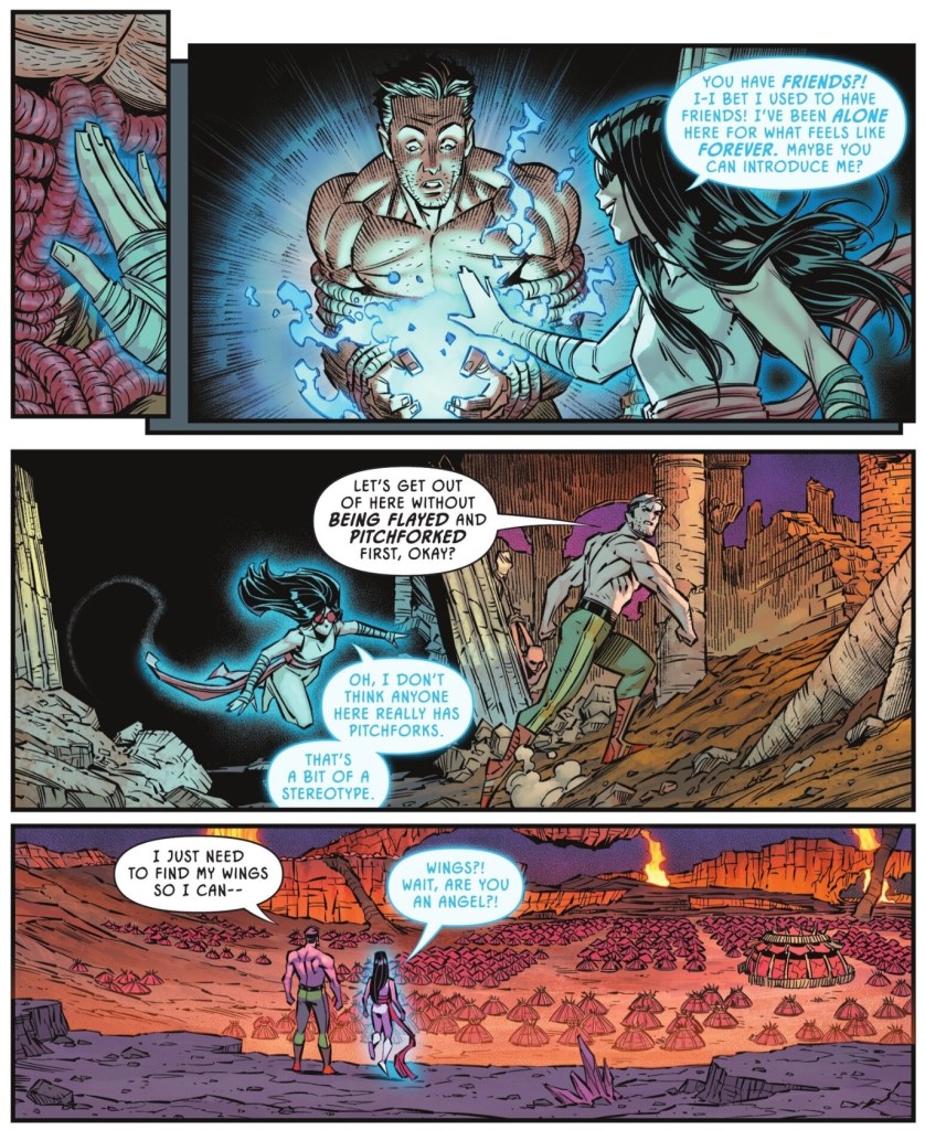 In Hell, Hawkman finally has hope of escape after being trussed up by the Demons Three thanks to a new player, a spirit who, although she doesn’t remember who she was, calls herself Kid Eternity.