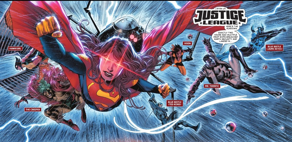 Maybe these drones can do some good, but the designs alone would scare ordinary folk. While Mercy and recovering villain Lex show what else they’ve made, Superwoman Lois Lane joins a Justice League squad’s mission to Markovia. Already devastated by recent events, the Mittel European state has been targeted by warriors from Khundia.