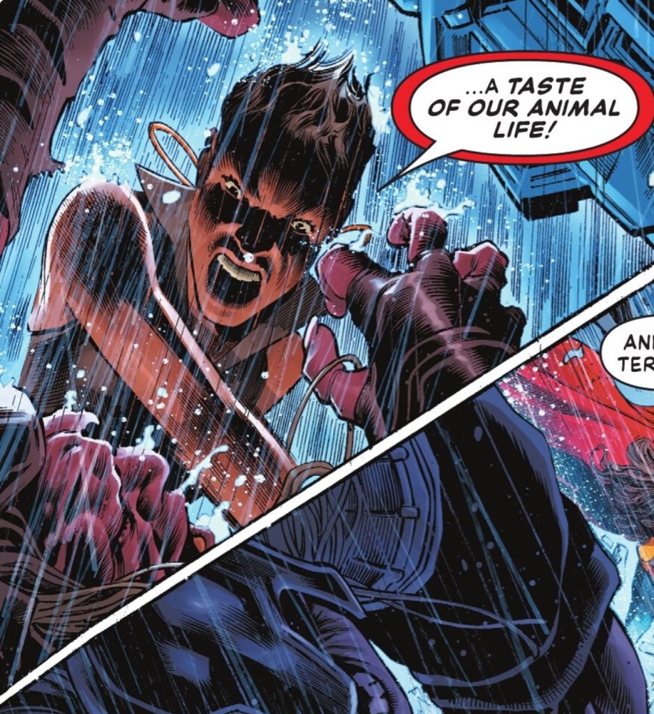 Now, was ‘Biblical rain’ part of Williamson’s script or did fill-in artist Eddy Barrows just fancy shaking things up a bit? Whoever had the idea, the execution by Barrows, inker Eber Ferreira and colour artist Alejandro Sánchez is brilliant. The near-vertical rainfall, the splashes off Blue Beetle’s mask, the puddle Creeper lands in… they all look great, adding extra visual drama to an already fun sequence.
