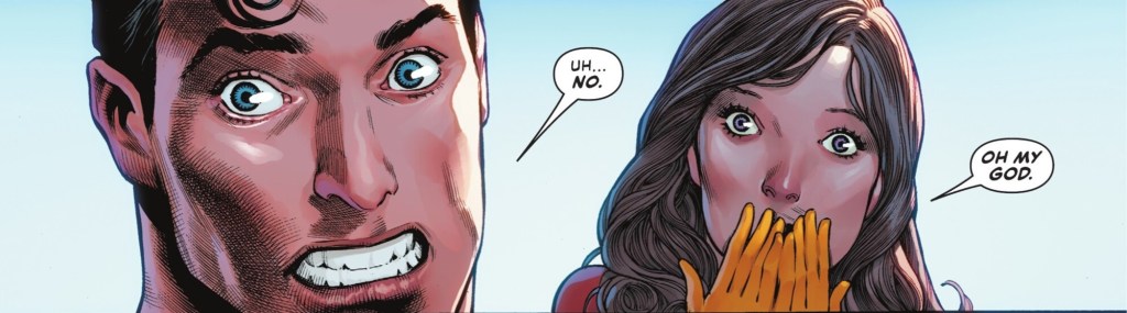 Writer Joshua Williamson continues to fill Superman’s world with action and intrigue, with this chapter’s JLU involvement a real bonus. While her current super-power set is known to be temporary, Lois doesn’t flinch from filling in for her Super-Hubby with the League, and is impressively unperturbed by having the seriously unhinged Creeper as her mission partner. Heck, she’s more taken aback by the start of this issue, in which she and Superman catch Mercy and Lex having a right old snog.