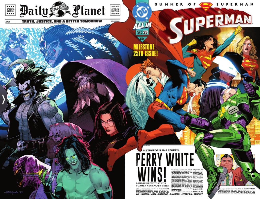 Too pithy? OK then, it’s the 25th issue of Joshua Williamson’s Superman series and it’s the culmination of pretty much all the ongoing plotlines. You may remember that last issue we learned that Lex Luthor’s Girlfriend, Mercy Graves, wasn’t too happy with the kinder, softer scientist of recent months. So unhappy was the CEO of Supercorp that she’d revived an old scheme which Lex had put on the backburner.