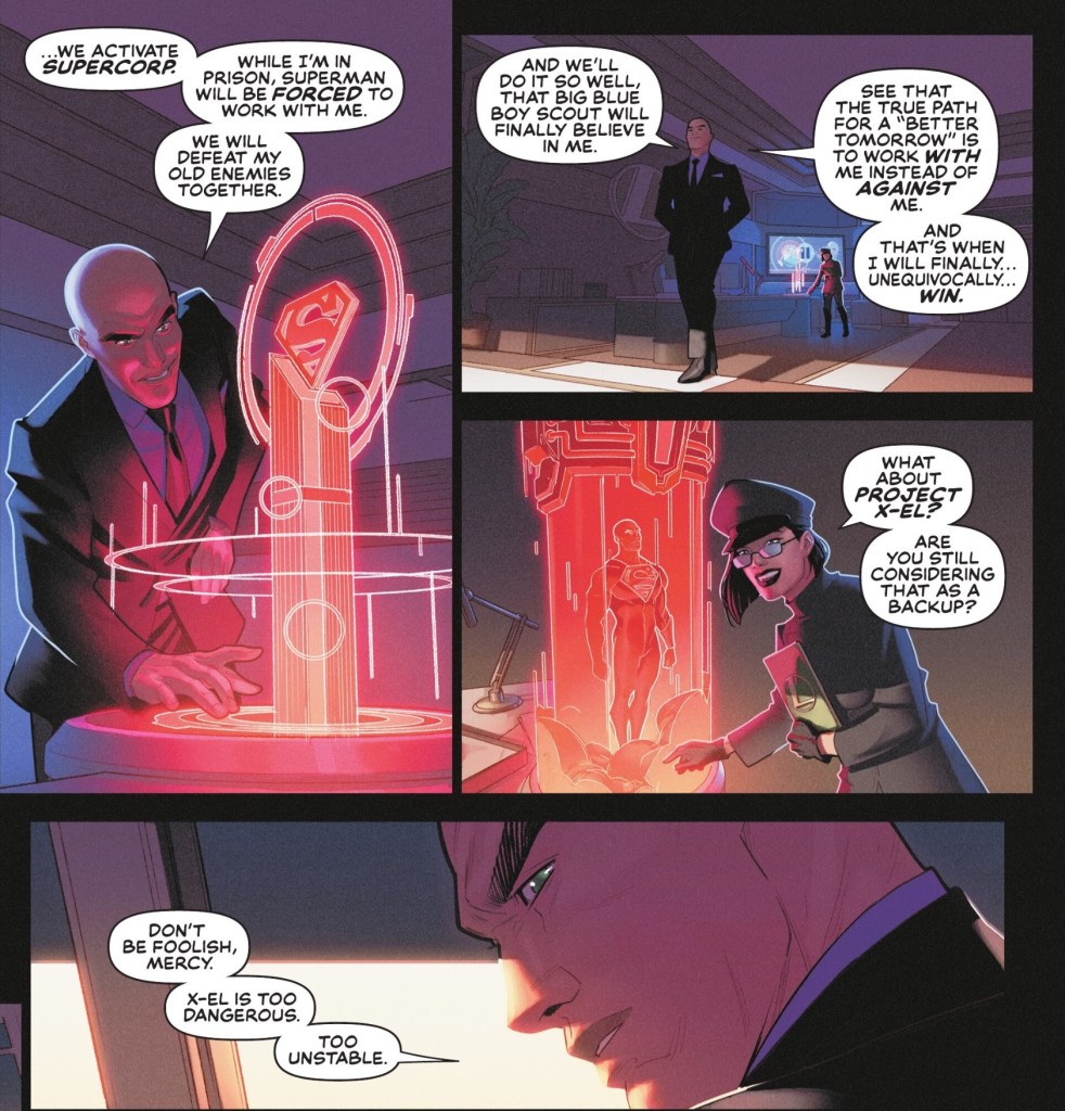 The Lex-a-like clone is a scary fella, full of hate, but hey, Mercy likes him. The name is interesting, X-El, which sounds like Lex is going for a Kryptonian name, but look again and it’s just ‘Lex’ backwards… well, with a wee hyphen.