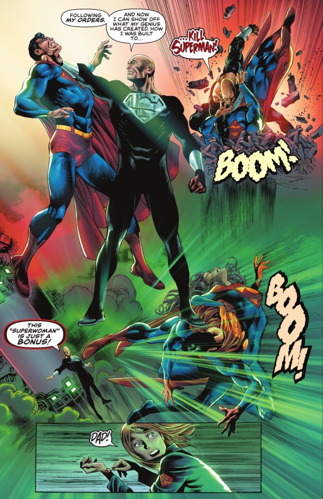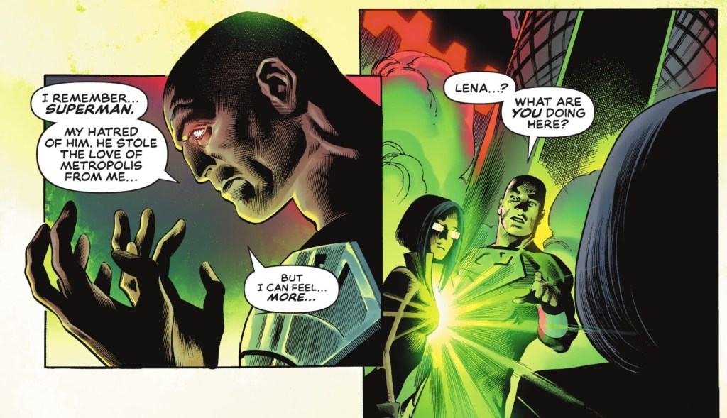What follows is one of the most satisfying Metropolis adventures in a good while as Superman, Superwoman Lois, Lex and X-El mix it up. Finally we learn whether Lex was sincere when he asked Superman to turn Lexcorp into a force for good. We see if the recently returned memories of his years as Superman’s arch-foe have erased the decent man he’s been since Brainiac gave him a reset. And we get the best moment for Lois since she gained super-powers like her husband’s (or rather, as we readers know but she doesn’t, like General Zod’s… exactly like General Zod’s).