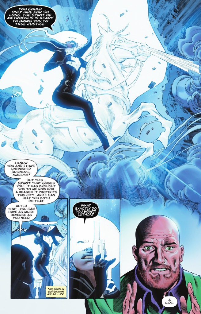 Marilyn Moonlight! We’ve not seen her in this book for a good while, but I’m delighted she’s back for this extra-length anniversary story. And so is Lex when she does indeed get him to Supercorp post-haste.