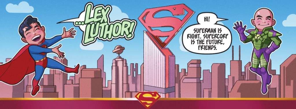 A bevy of great artists provide the images. Original series artist Jamal Campbell drops by for the first couple of pages, which includes a cartoon promoting the future Supercorp.