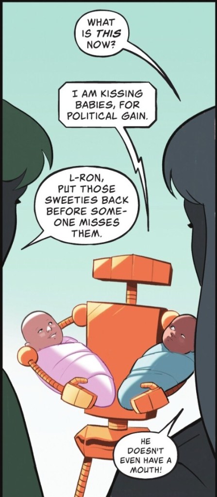 I’m impressed by how connected this series is with current DC Universe events, I never expected the Justice League Unlimited/World’s Finest tie-in. And Starer has a great handle on former JLI office manager L-Ron, who wants to be Mayor of Smallville.