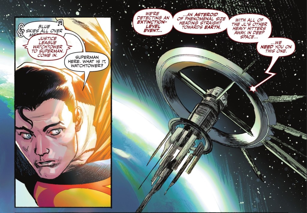 Did the Scarecrow escape from Oz and borrow a super-suit? It’s a shame, pretty much everyone else in the issue looks fine, the flashback is mostly terrific and the asteroid sequence is as effective as it is powerful – but Superman hasn’t yet clicked for the artist. Hopefully that’ll happen soon.