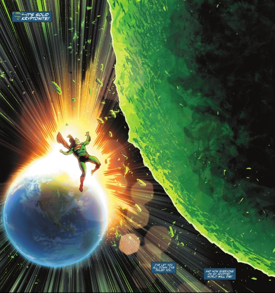 Dan Slott, in his first DC series for decades, throws Superman a curveball – a massive, green, glowing curveball. Superman manages to divert the Kryptonite asteroid enough to stop it extinguishing all life on Earth, but when it makes landfall he’s underneath it.