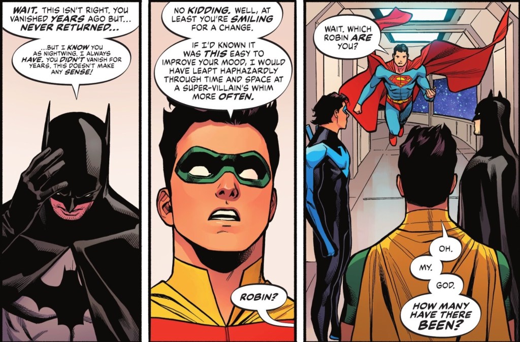 Older Dick, Nightwing, has no memory of this moment, leading Superman and Batman to theorise that time is broken. Cue the walls of reality falling for a moment.